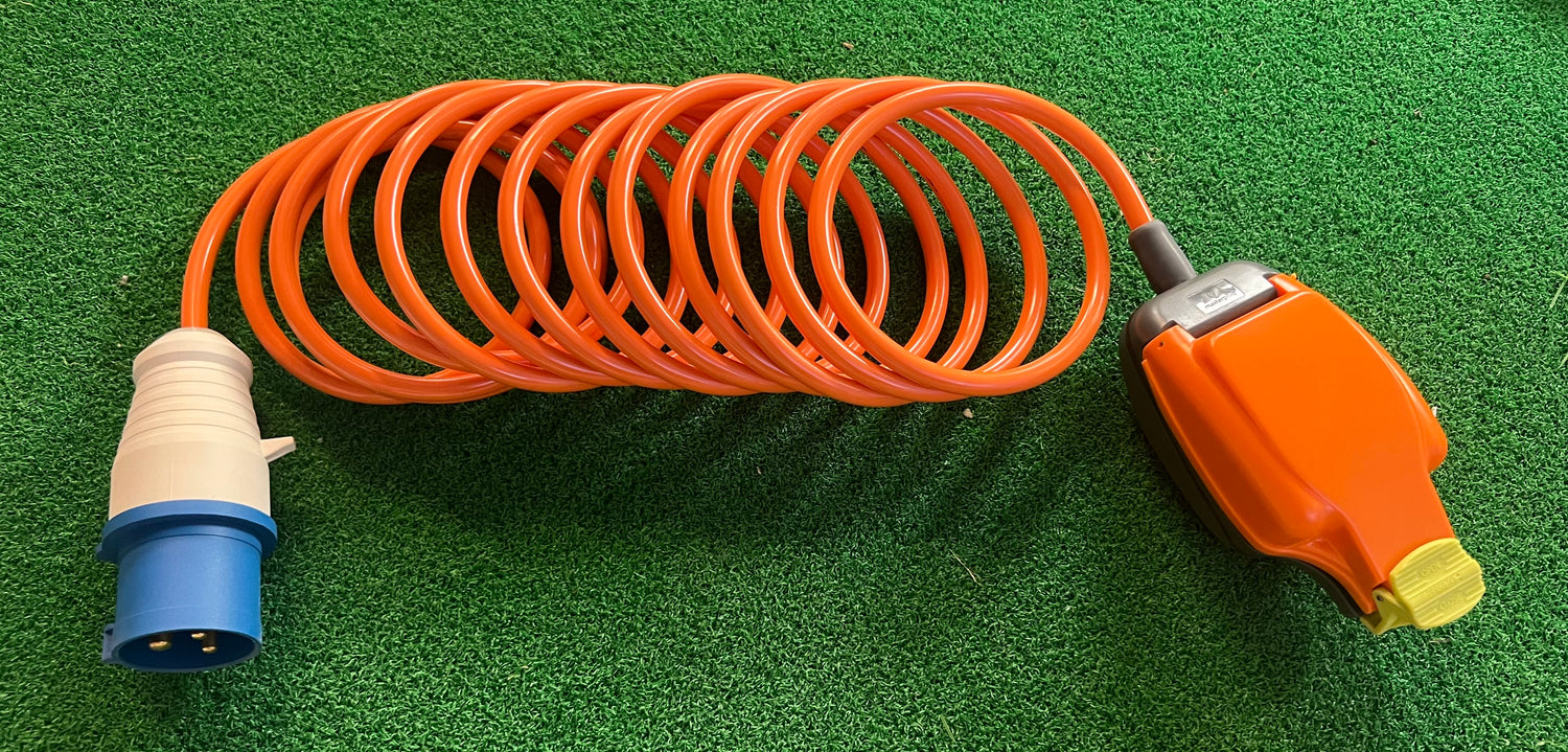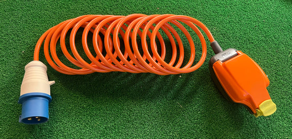 This highly durable Camping and Caravan 240v Mains retractable Hook Up Lead by ARC is the perfect solution for your electrical needs inside your tent. With a 16amp CEE plug and 2P+E weather and splash proof connector style a push-on termination type for easy use. The lead is made from high-quality, double insulated Hytrel material and comes in lengths of 5m, 7.5m or 10m (16 feet, 25 feet or 33 feet), making it ideal for long-distance connections. The orange-coloured coiled lead has one male IP44 connector and is designed with a blue connector style. It also has a Masterplug IP54 weatherproof socket to protect it from rain and unpredictable weather.
