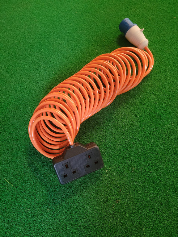 This highly durable Camping and Caravan 240v Mains retractable Hook Up Lead by ARC is the perfect solution for your electrical needs. With a 16amp CEE plug and 2P+E weather and splash proof connector style a push-on termination type for easy use. The lead is made from high-quality, double insulated Hytrel material and comes in lengths of 5m, 7.5m or 10m (16 feet, 25 feet or 33 feet), making it ideal for long-distance connections. The orange-coloured coiled lead has one male IP44 connector and a black 2-way socket.